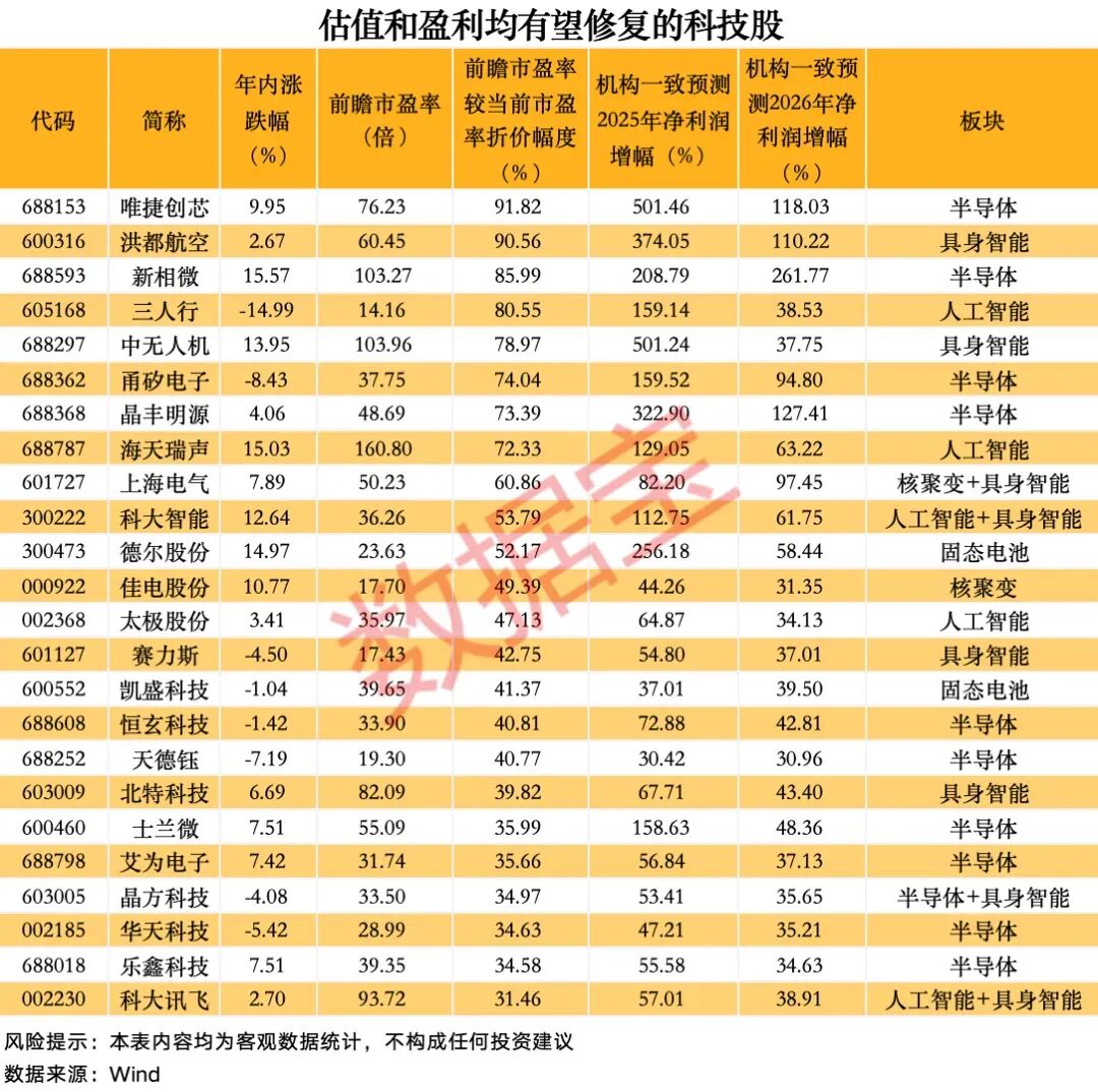 據(jù)證券時(shí)報(bào)·數(shù)據(jù)寶不完全梳理,結(jié)合機(jī)構(gòu)觀點(diǎn)及一致預(yù)測數(shù)據(jù),上述五大科技領(lǐng)域中,24家公司有望實(shí)現(xiàn)估值與盈利雙重修復(fù)。篩選條件包括:2026年預(yù)測市盈率(正值,下稱前瞻市盈率)較當(dāng)前滾動(dòng)市盈率折價(jià)超30%;機(jī)構(gòu)一致預(yù)測2025年、2026年凈利潤增幅均超30%(含2025年有望扭虧為盈的公司);年內(nèi)漲幅低于16%(跑輸上證指數(shù))。具體來看,前瞻市盈率較當(dāng)前滾動(dòng)市盈率折價(jià)超過50%的公司有11家,包括唯捷創(chuàng)芯、洪都航空、新相微等。